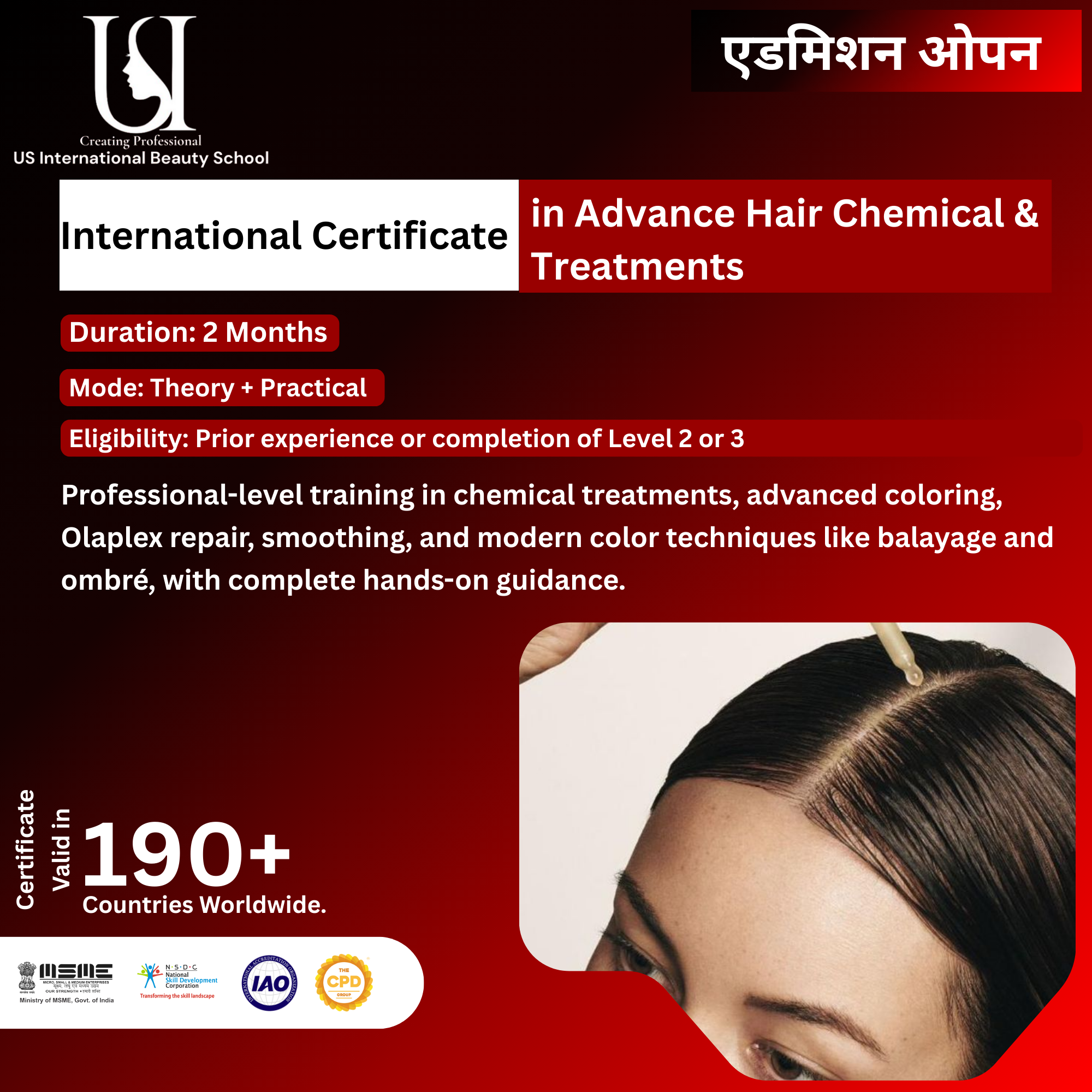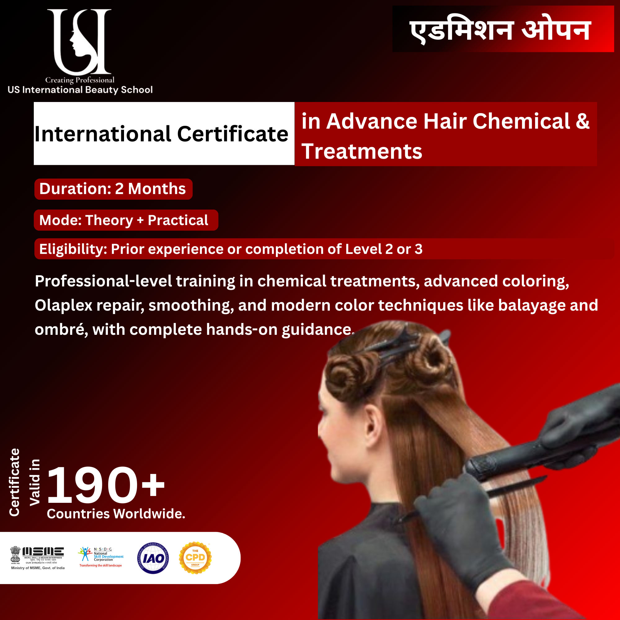 Take your hairstyling career to the next level with the Advance Hair Chemical & Treatments Course in Delhi NCR, The Advance Hair Chemical & Treatments Course at US International Beauty School is designed for students and professionals who want to master high-demand salon services.