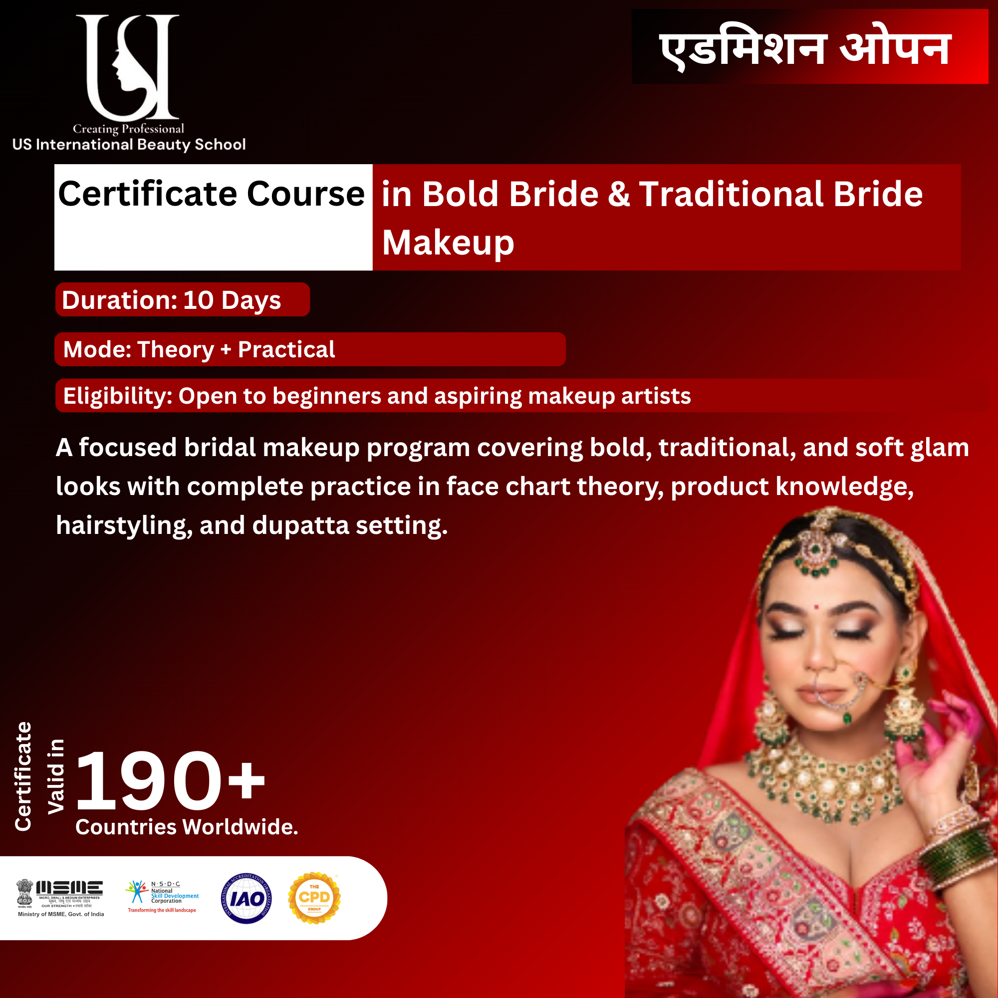 Learn Best Bold Bride & Traditional Bride in Delhi NCR with US International Beauty Academy. Master the art of Bold and Traditional Bridal Makeup. Learn to create stunning contemporary bridal looks and timeless traditional styles and cultural elegance for every bride’s special day.