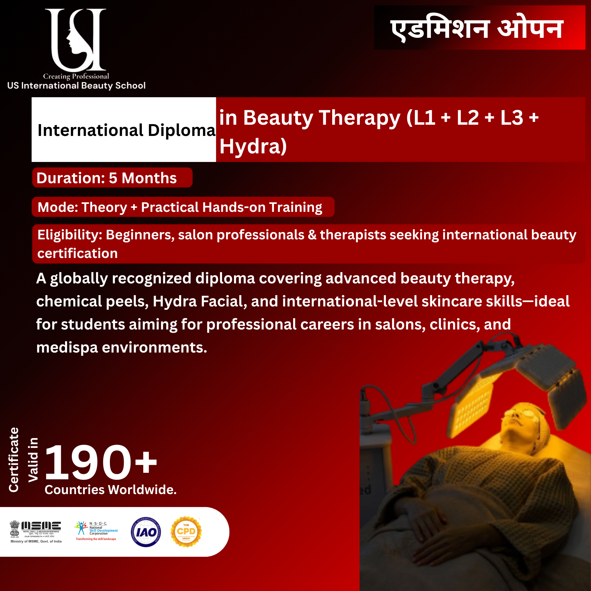 Join the Best Diploma Program in Beauty Therapy Course in Delhi NCR, A complete multi-level beauty therapy program covering fundamentals, advanced skincare, chemical peels, exfoliation, and Hydra Facial techniques—ideal for beginners and professionals seeking international certification and industry-ready expertise.