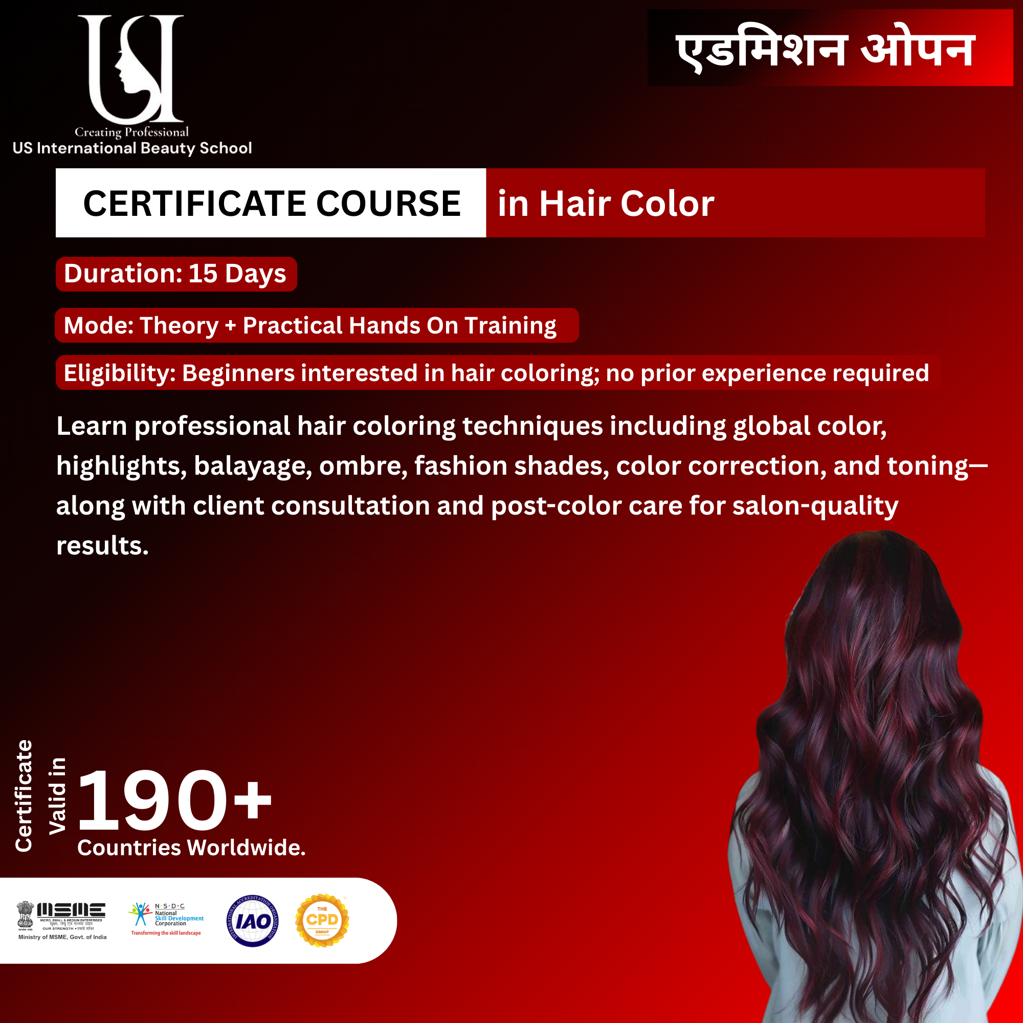 Take your hairstyling career to the next level with the Best Hair Color Hairstyling Course in Delhi NCR,The Hair Color Course at US International Beauty School provides comprehensive training in professional coloring techniques used in top salons. Students learn global coloring, root touch-ups, fashion shades, highlights, lowlights, balayage, ombré, and color correction.