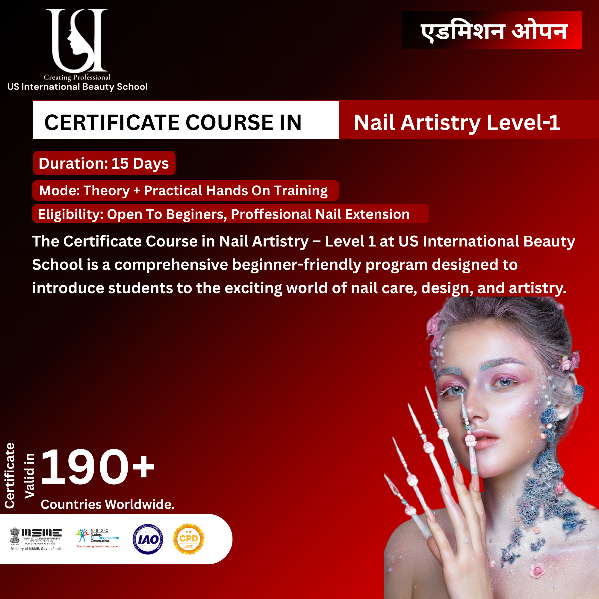 Best Nail Artistry Course in Delhi NCR, offered by US International Beauty School, Rajouri Garden. This 1-month international certification program is ideal for beginners, beauty enthusiasts, and aspiring nail artists who want to master the fundamentals of nail care, hygiene, extensions, and creative art styles.