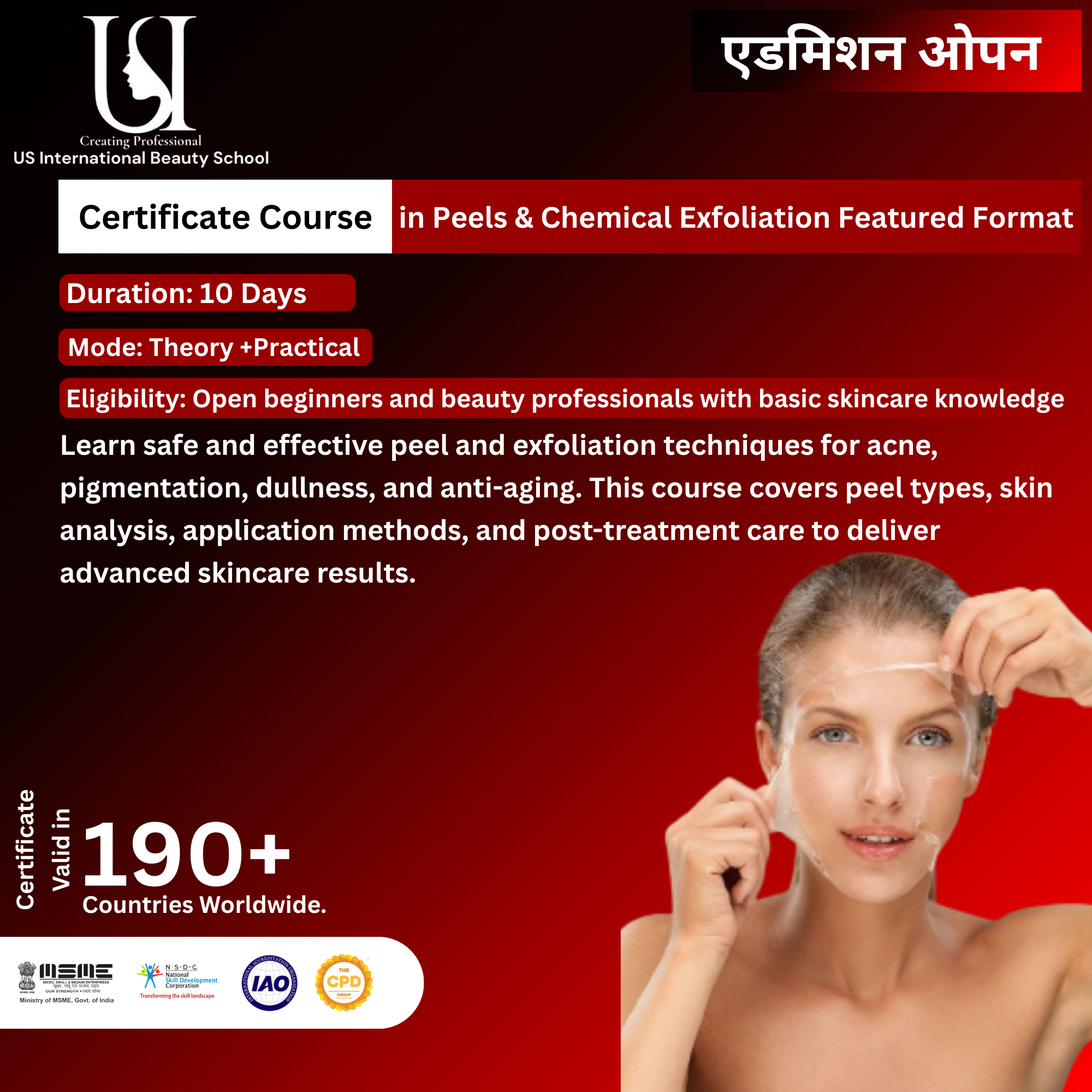 US International Beauty School of Rajouri Garden offers a certification course in Peels & Chemical Exfoliation (Level 3) to start your career as a Beauty Industry professional.