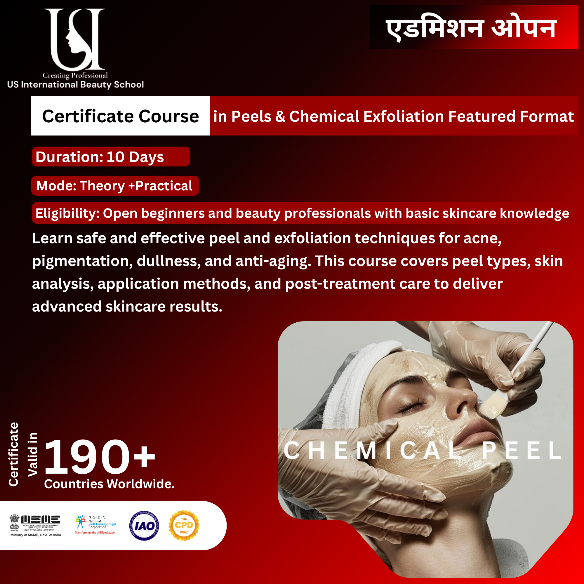 Open to beginners, beauty learners, and skincare professionals with basic skincare knowledge. Suitable for those wanting to master chemical peels, exfoliation techniques, and treat skin concerns like acne, pigmentation, dullness, and aging.