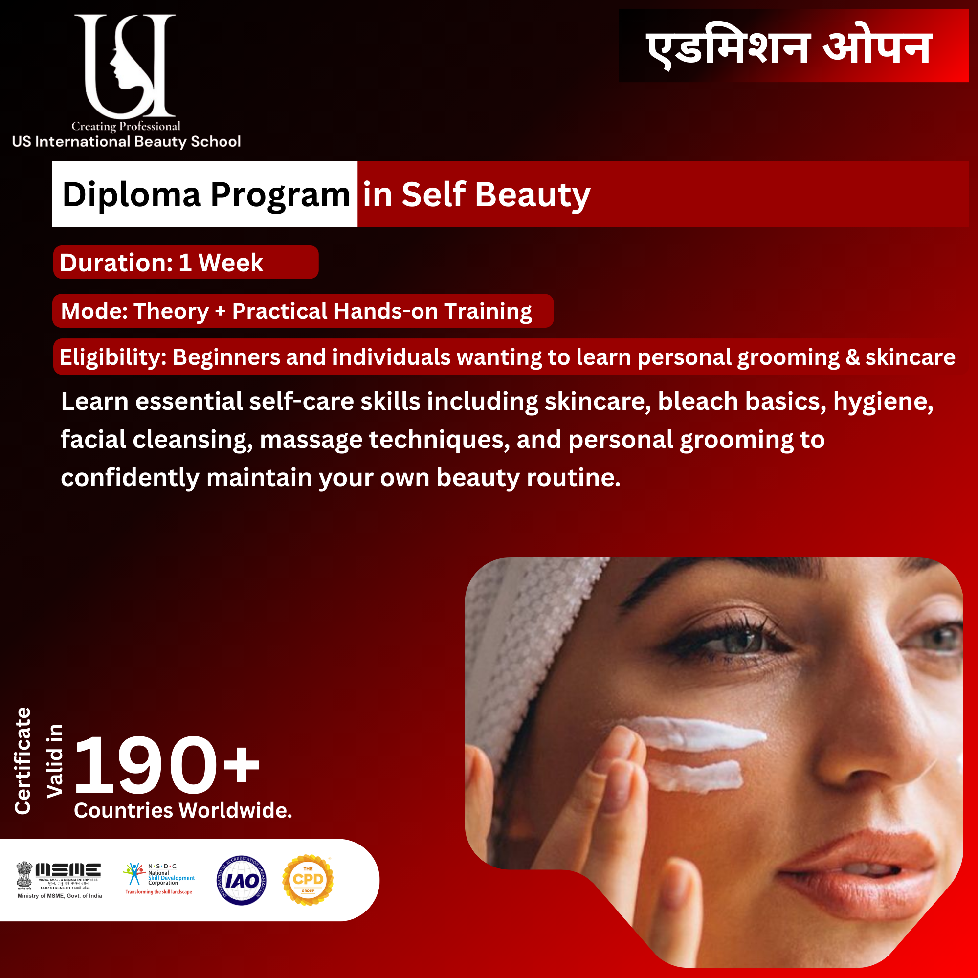 Our Best Self Beauty Course in Delhi NCR The Self Beauty Course at US International Beauty School is designed to help individuals enhance their personal grooming and everyday appearance with ease. This course covers essential self-care skills, including skincare routines, hair maintenance, basic makeup application, personal hygiene, and product knowledge.