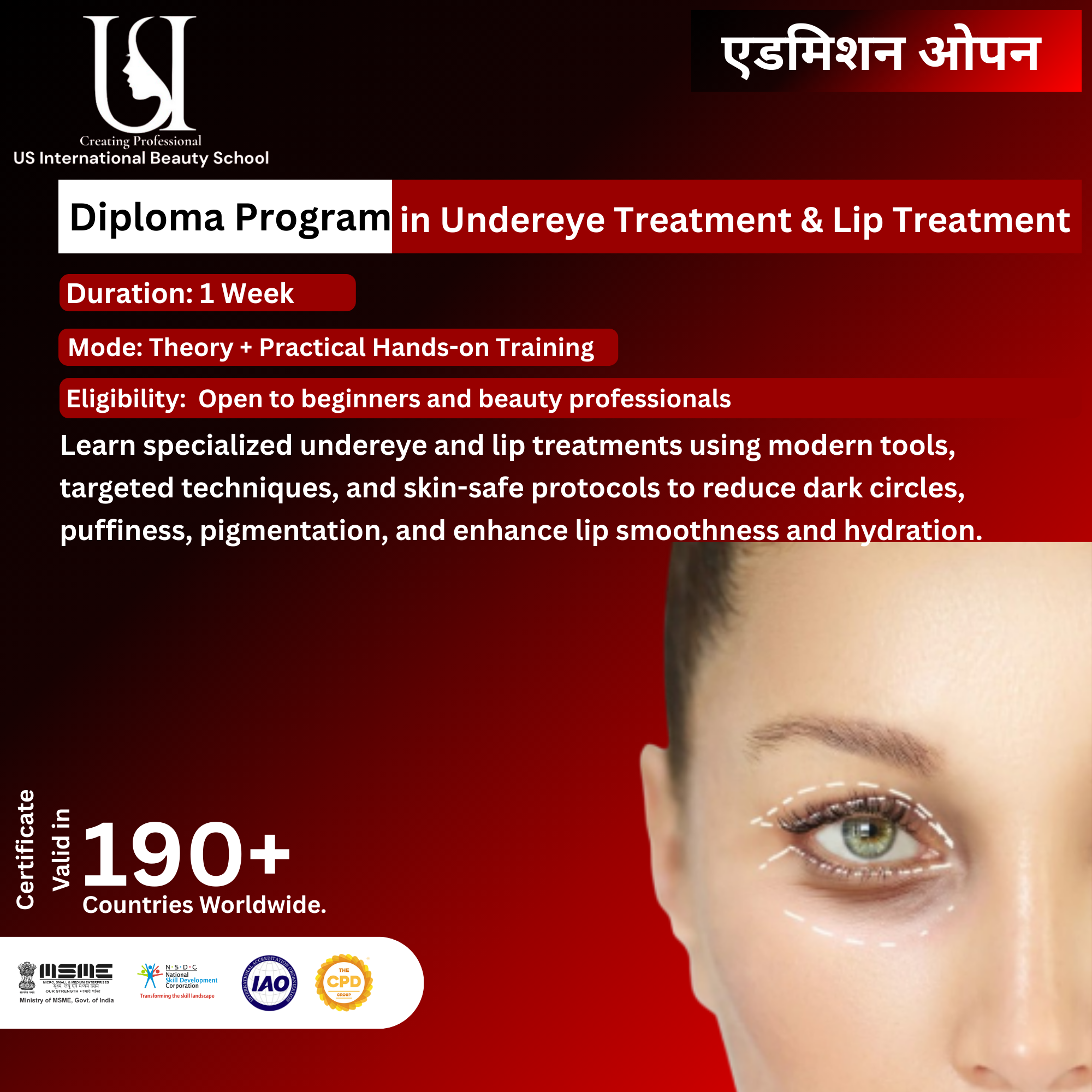 Our Best Skin Treatment Course in Delhi NCR The Undereye Treatment & Lip Treatment Course at US International Beauty School trains students in advanced techniques to rejuvenate, brighten, and firm delicate under-eye and lip areas.